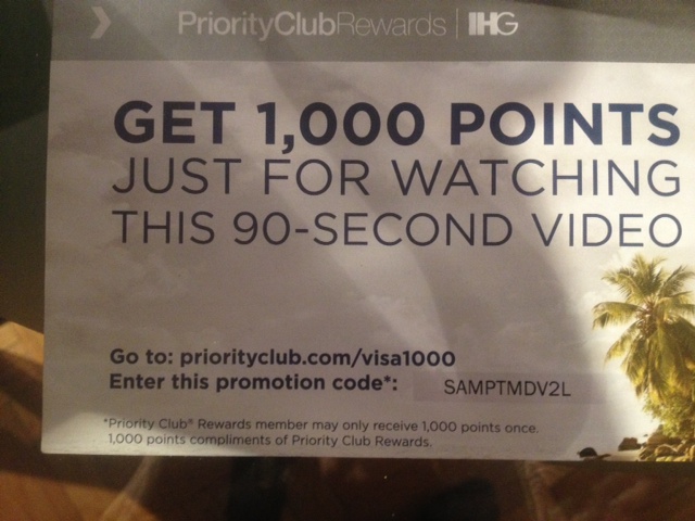 I typed the info and promo code into my computer, watched the video about benefits of the Priority Club Rewards Visa Card, and, voila, was told I was rewarded with 1000 points. Also, the video finished with a page to apply for the Visa card. While the leaflet mentioned the application bonus for the card was 60,000 points, the screen before me offered me 80,000 points (too late, I already have that credit card!).