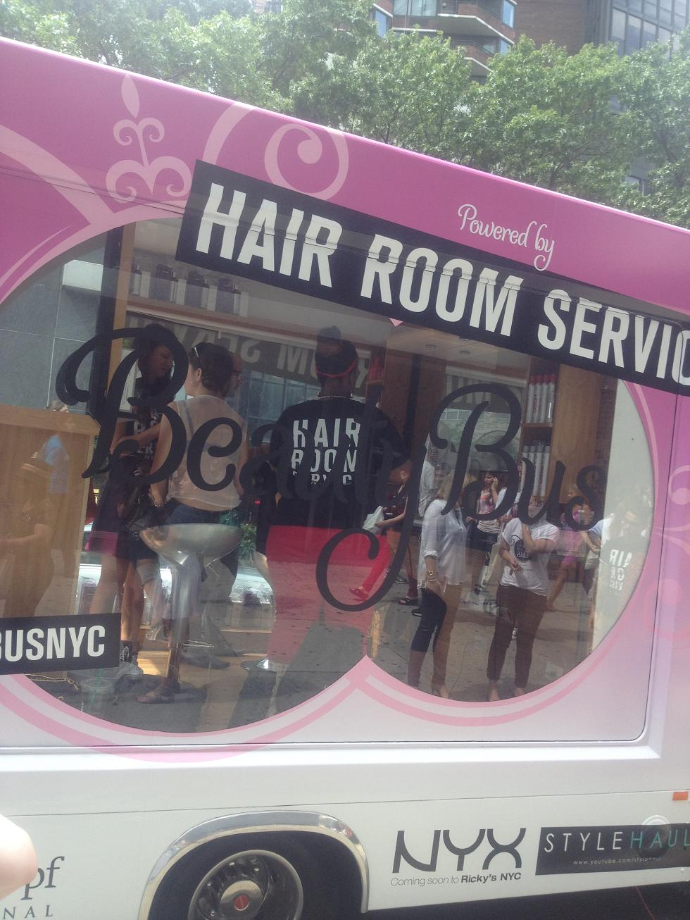 So, this morning as I was getting ready to go for a run, I read that there was something called the Hair Room Service Beauty Bus. I read further. The “Beauty Bus” is a glass truck outfitted with styling chairs, mirrors, and beauty product must-haves, and that it would be parked on the Upper West Side of Manhattan offering free professional makeup applications, hairstyling, and manicures!