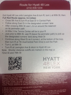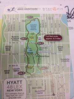This map comes to us from Hyatt 48 Lex, on 48th Street and Lexington Avenue, in Manhattan. The Map directs runners to Central Park, my home-away-from-home. I like Hyatt jogging maps, they are the perfect size and durability. A good souvenier, even if you don’t run.