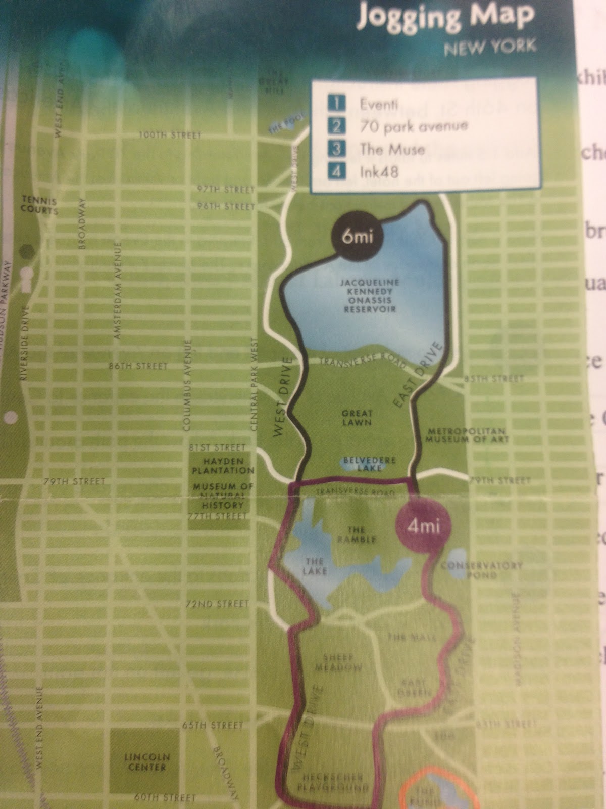 The hotel gave me a very cool Jogging Map. It is intended to cover all four Kimpton Hotels in New York City – the Eventi, Ink48, the Muse and 70Park. The Jogging Map lays out runs of varying distances, run primarily in Central Park or along the Hudson River. The Jogging Map is fairly long long, so I had to split the photo into three pictures: